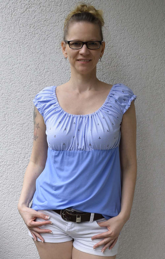 Carmenbluse kurze Puffärmel Punkte Babyblau Marine