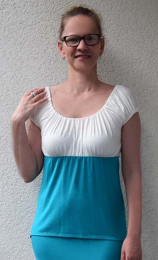 Carmenbluse kurze Puffärmel Punkte Türkis
