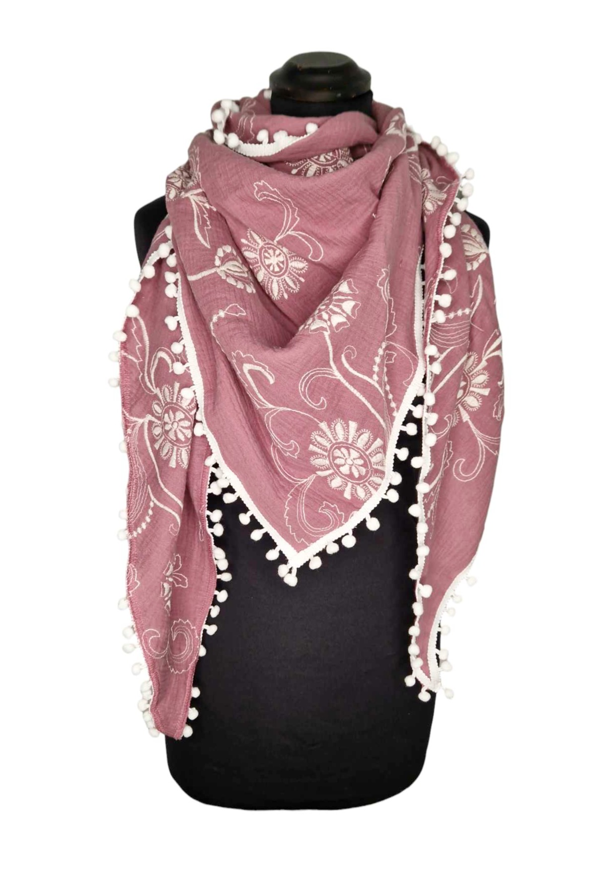 Musselintuch Dreiecksformat Bestickt Blumen mit Bommelborte altrosa